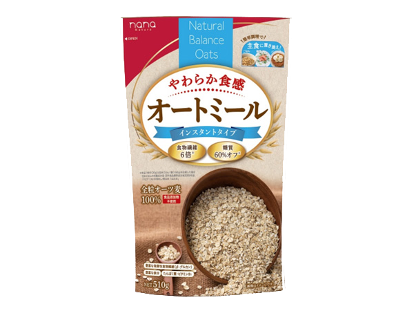 ロールドオーツをさらに細かく加工し、調理時間を短縮したもので、お湯をかけるだけで食べられる。